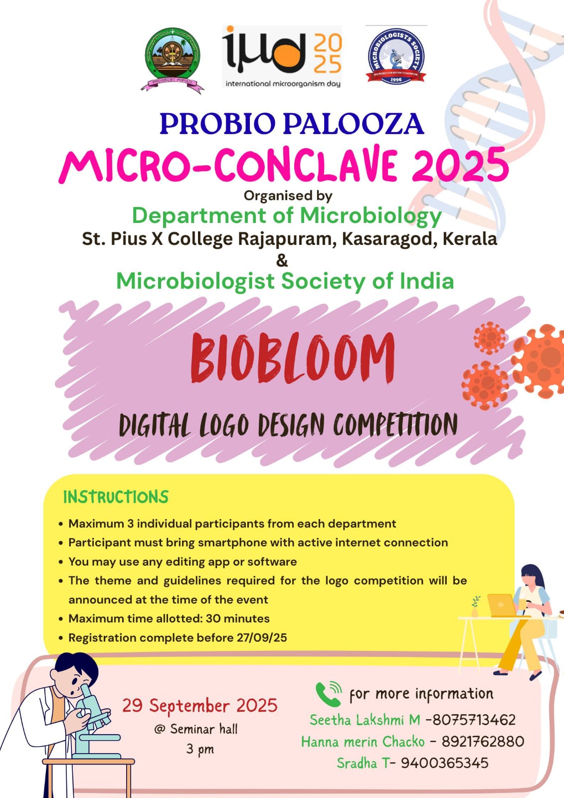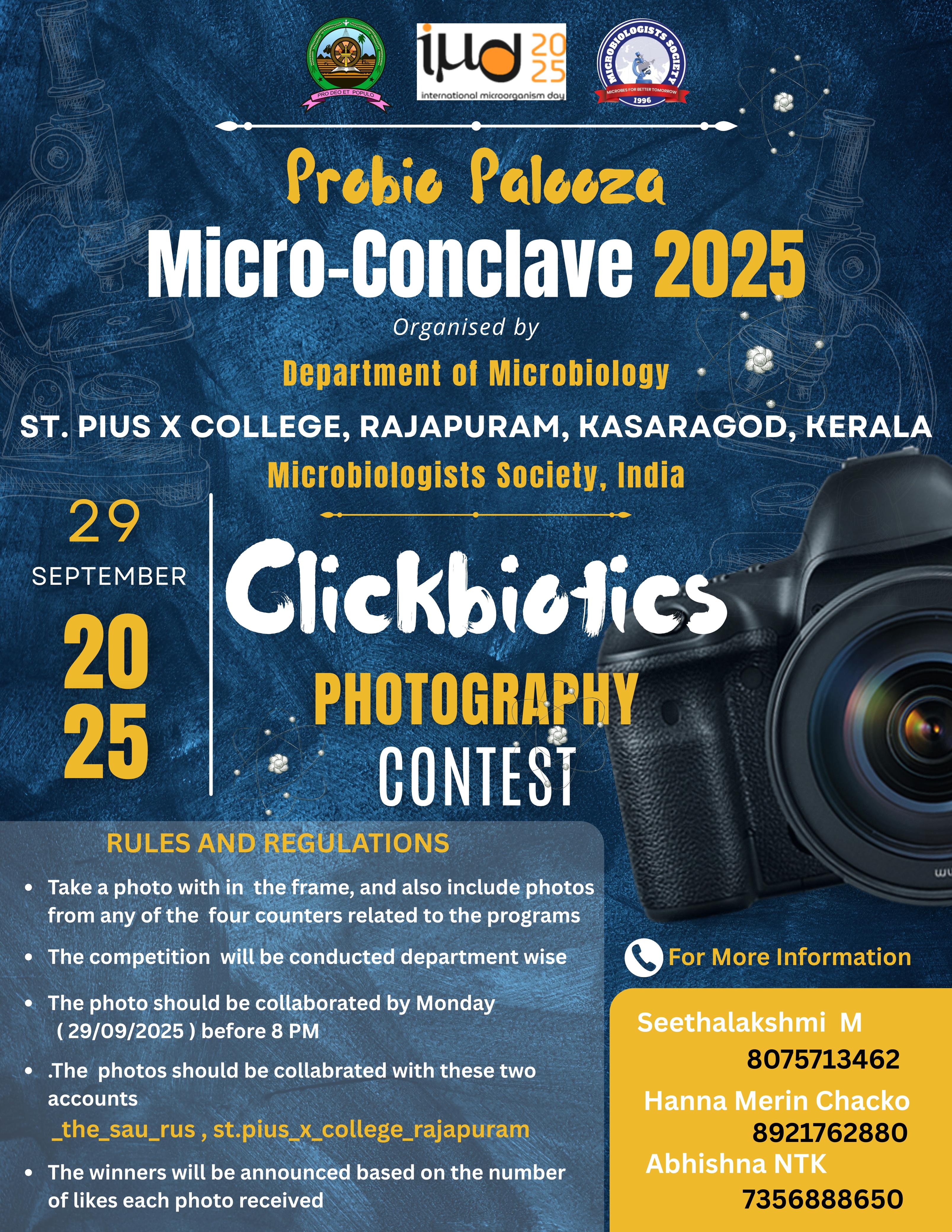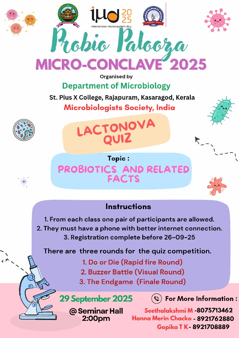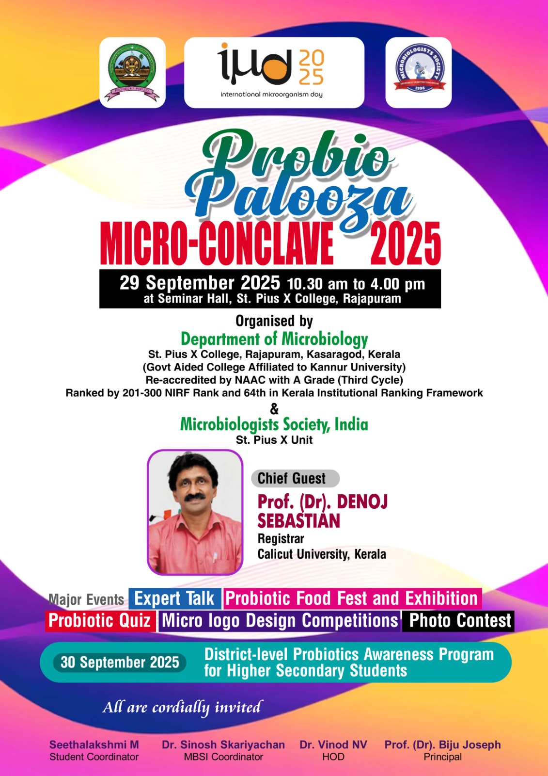 The Department of Microbiology is excited to announce the "Probiotics Conclave-Probio Palooza" organized by the Department of Microbiology, St Pius X College, Kasaragod along with MBSI ! The event aims to promote the importance of probiotics and its health benefits among students. We are going to make this program as a mega event with various program and we are going to visit more than 25 plus schools and reaching out to higher secondary students to provide awareness on probiotic food including butter milk. Events (1) Talk by expert on probiotics (2) Competitions for students (3) Probiotic Food Fest (4) District level Probiotic Awareness Program for Higher Secondary students Date: September 29-30, 2025
