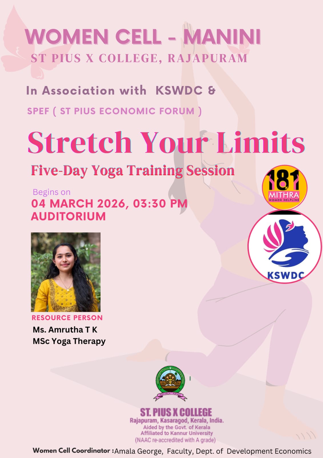 Women Cell- Manini St Pius X college, Rajapuram, in association with the Kerala State Women’s Development Corporation (KSWDC) and St. Pius Economic Forum, is organizing a Five-Day Yoga Training Session * starting from *4th March 2026, 3:30 p.m. at the College Auditorium.