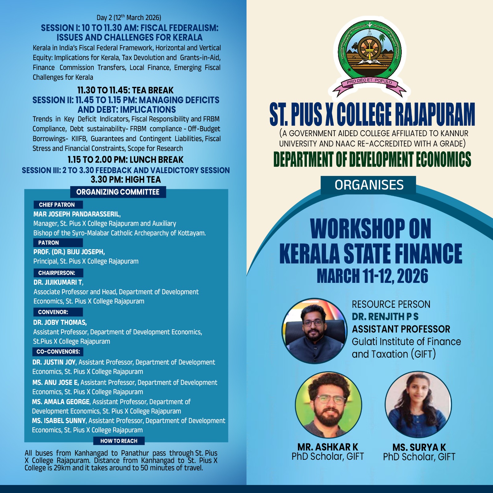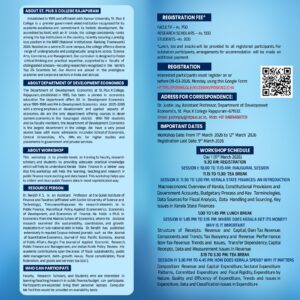 The Department of Development Economics, St. Pius X College, Rajapuram, organises a two day workshop on Kerala State Finance from March 11–12, 2026 by Dr. Renjith P S (GIFT). The sessions will cover fiscal federalism, debt sustainability, KIIFB, and public finance data. This is a vital opportunity for students, scholars, and faculty to engage with Kerala’s fiscal challenges.